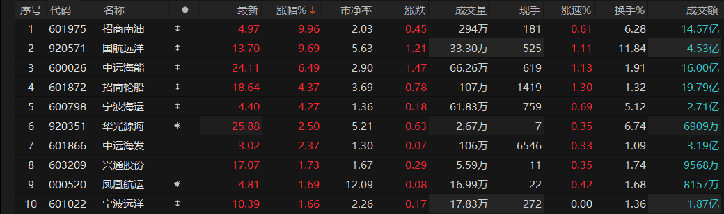 航运概念延续强势,招商南油2连板,国航远洋、中远海能、招商轮船、宁波海运跟涨。