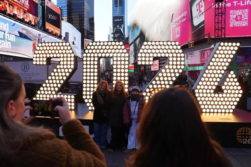 2025年12月22日,在美国纽约时报广场,游客在2026年数字牌前留影。新华社记者张凤国摄