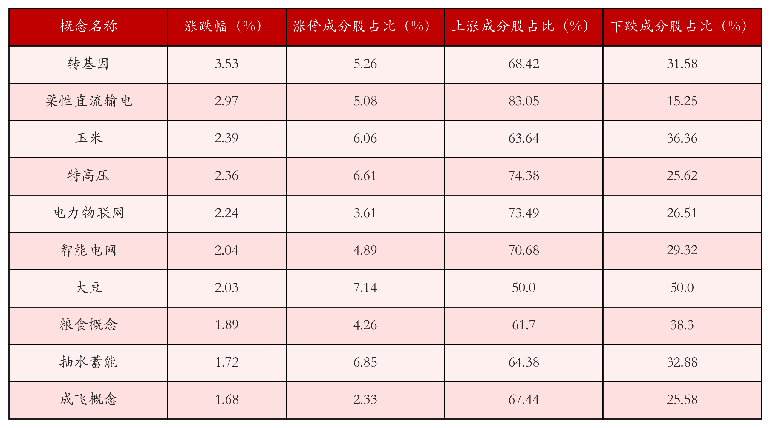 根据A股概念涨跌幅与所对应的股票池综合分析,涨幅靠前的三个概念板块分别为:转基因、柔性直流输电与玉米。排名前10位的概念板块相关数据见下表: