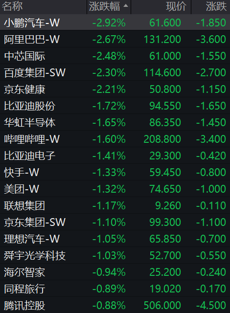 科网股集体下跌,小鹏汽车跌近3%,阿里巴巴、百度集团、中芯国际、京东健康跌超2%,比亚迪股份、华虹半导体、京东集团、美团等跌超1%,腾讯控股、同程旅行等低开。