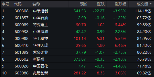 个股方面,中际旭创成交额超114亿元居首,中国石油、特变电工、中国海油成交额靠前。