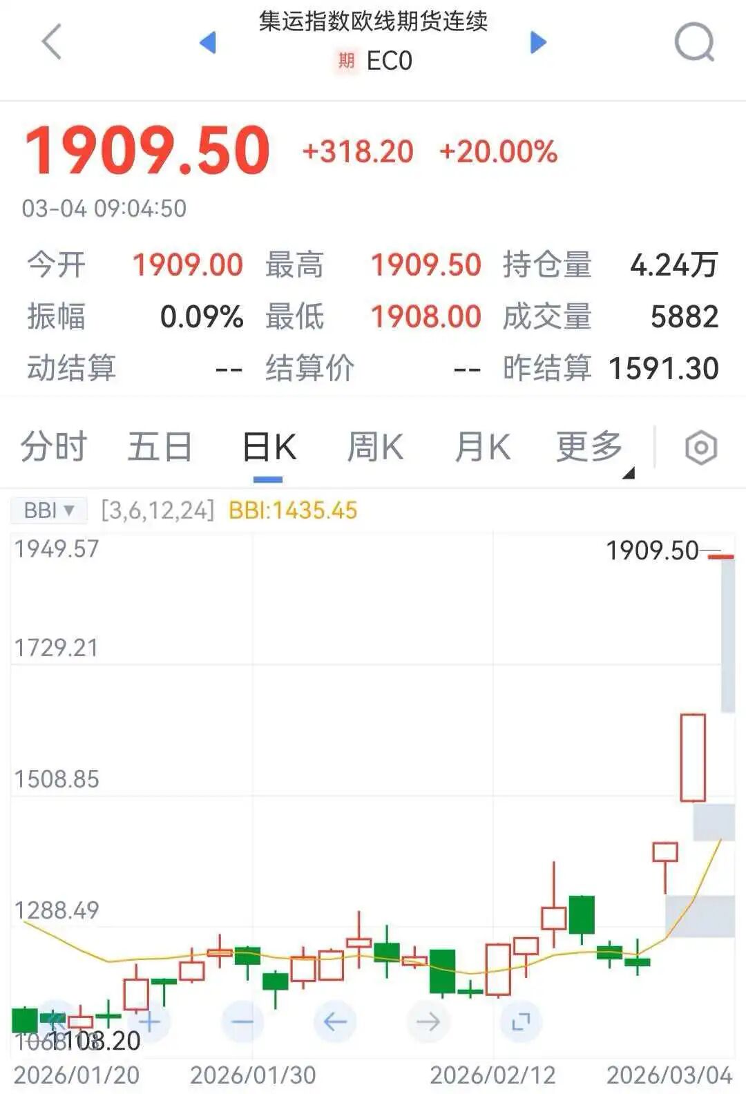 国内期货主力合约多数上涨,集运欧线涨停,涨幅20%,SC原油封涨停,燃油涨超12%,低硫燃料油(LU)涨近10%,液化石油气(LPG)涨超6%,甲醇涨超4%。跌幅方面,沪锡跌超7%,沪银跌超5%。