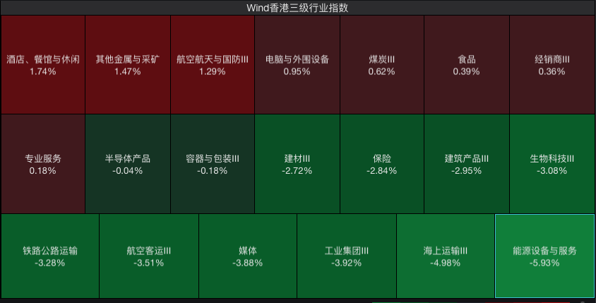 涨幅前三的板块包括酒店、餐馆与休闲Ⅲ(+1.74%)、其他金属与采矿Ⅲ(+1.45%)、航空航天与国防Ⅲ(+1.29%),其中普星能量(0090.HK, +4.39%)、第一拖拉机股份(0038.HK, +0.22%)、东方电气(01072.HK, +11.4%)领涨。