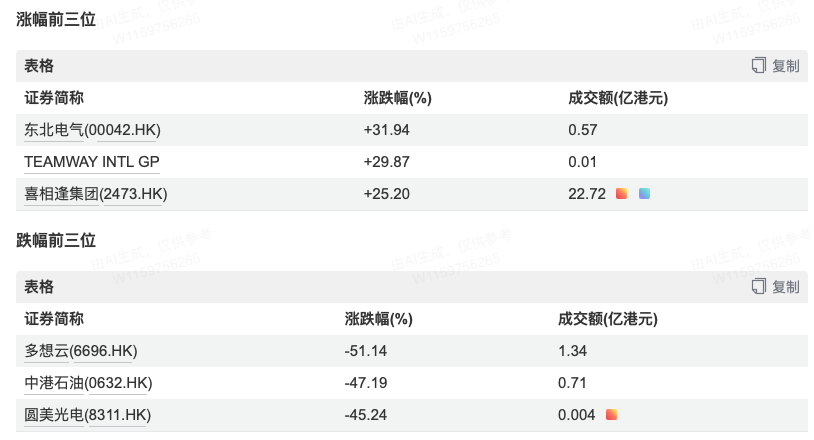 从个股表现来看,小市值股涨幅居前,东北电气(0042.HK, +31.94%)、TEAMWAY INTL GP(1239.HK, +29.87%)、喜相逢集团(2473.HK, +25.20%)分列前三,或为超跌反弹或题材驱动;能源相关个股重挫,多想云(6696.HK, -51.14%)、中港石油(0632.HK, -47.19%)、圆美光电(8311.HK, -45.24%)或因前期过热后资金撤离。