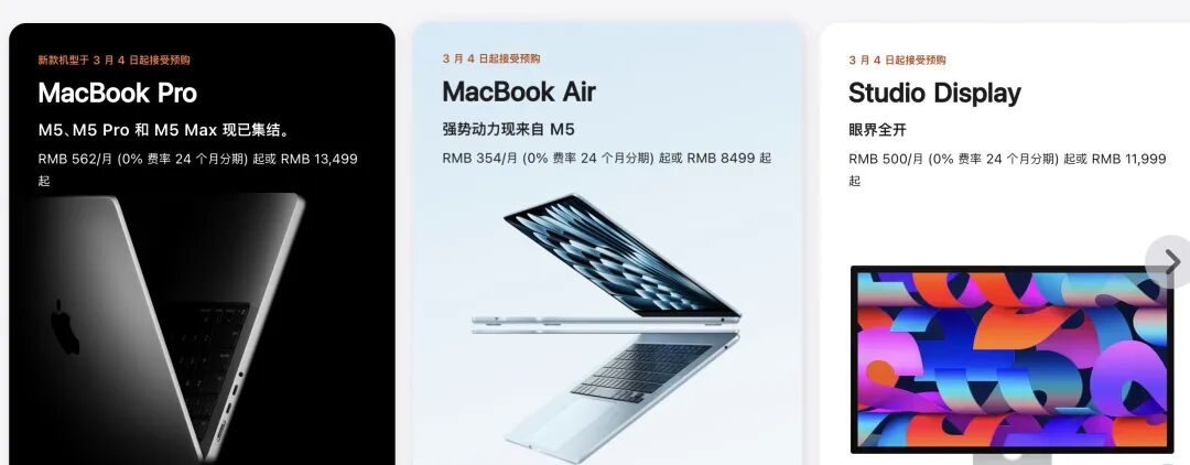 3月3日晚间,苹果公司继续通过官网更新的方式上新,推出了新款14英寸和16英寸MacBook Pro机型,搭载全新M5 Pro和M5 Max芯片,以及搭载M5芯片的MacBook Air,在性能、AI算力及存储等方面全方位升级。