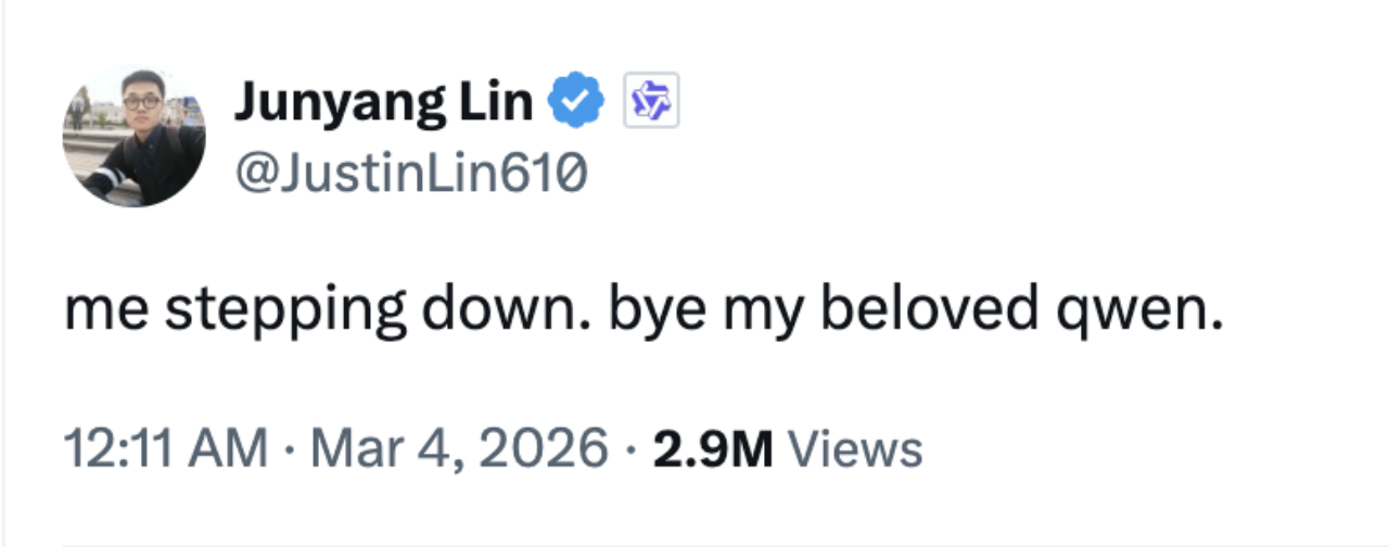 3月4日凌晨,阿里千问大模型技术负责人林俊旸在社交平台X上发文:“me stepping down. bye my beloved qwen.”(我卸任了。再见了,我亲爱的千问。)