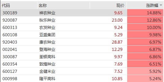 3月4日,农业股盘中逆势拉升,截至午盘,神农种业、秋乐种业涨超10%,农发种业涨停,亚盛集团、康农种业、登海种业等个股跟涨。