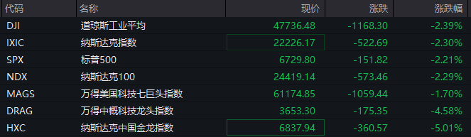 芯片股全线下挫,费城半导体指数跌超4.5%,CREDO TECHNOLOGY跌超16%,闪迪、美光科技跌超6%,英特尔、阿斯麦、台积电、安森美半导体、ARM等跌超5%,超威半导体、迈威尔科技跌超3%。