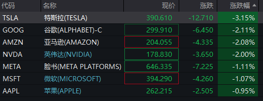 具体板块方面,科技股普遍下跌,七巨头全线下跌,特斯拉跌超3%。