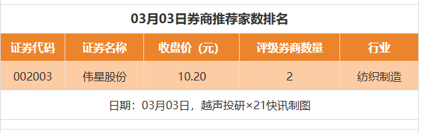 从券商推荐家数来看,3月3日有19家上市公司得到券商推荐,其中伟星股份获得2家推荐,东吴证券、上汽集团等获得1家推荐。