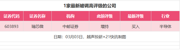 评级调高方面,3月3日,券商调高上市公司评级达到1家次,最新数据为中邮证券对瑞芯微的评级从“增持”调高至“买入”。