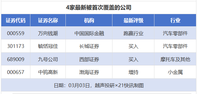 首次覆盖方面,3月3日券商共给出了4次首次覆盖,其中万向钱潮获得中国国际金融给予“跑赢行业”评级,毓恬冠佳获得长城证券给予“买入”评级,九号公司获得西部证券给予“买入”评级,中钨高新获得渤海证券给予“增持”评级。