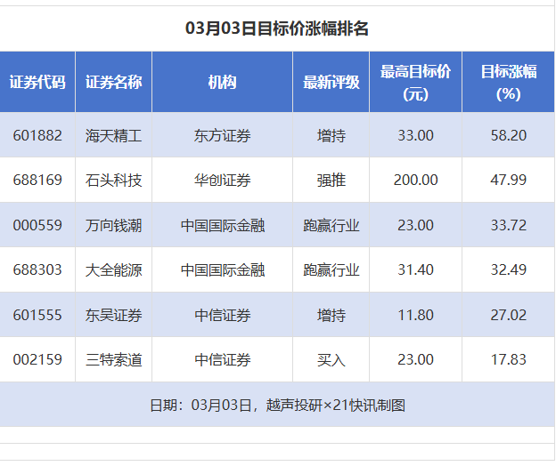 越声投研数据显示,3月3日,券商给予上市公司目标价共6次,按最新收盘价计算,目标价涨幅排名居前的公司有海天精工、石头科技、万向钱潮,目标价涨幅分别为58.20%、47.99%、33.72%,分别属于通用设备、小家电、汽车零部件行业。