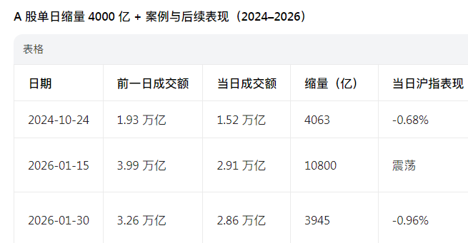 最近两天行情中,出现过3次,日缩量超4000亿元,随后几个交易日都是震荡修复。