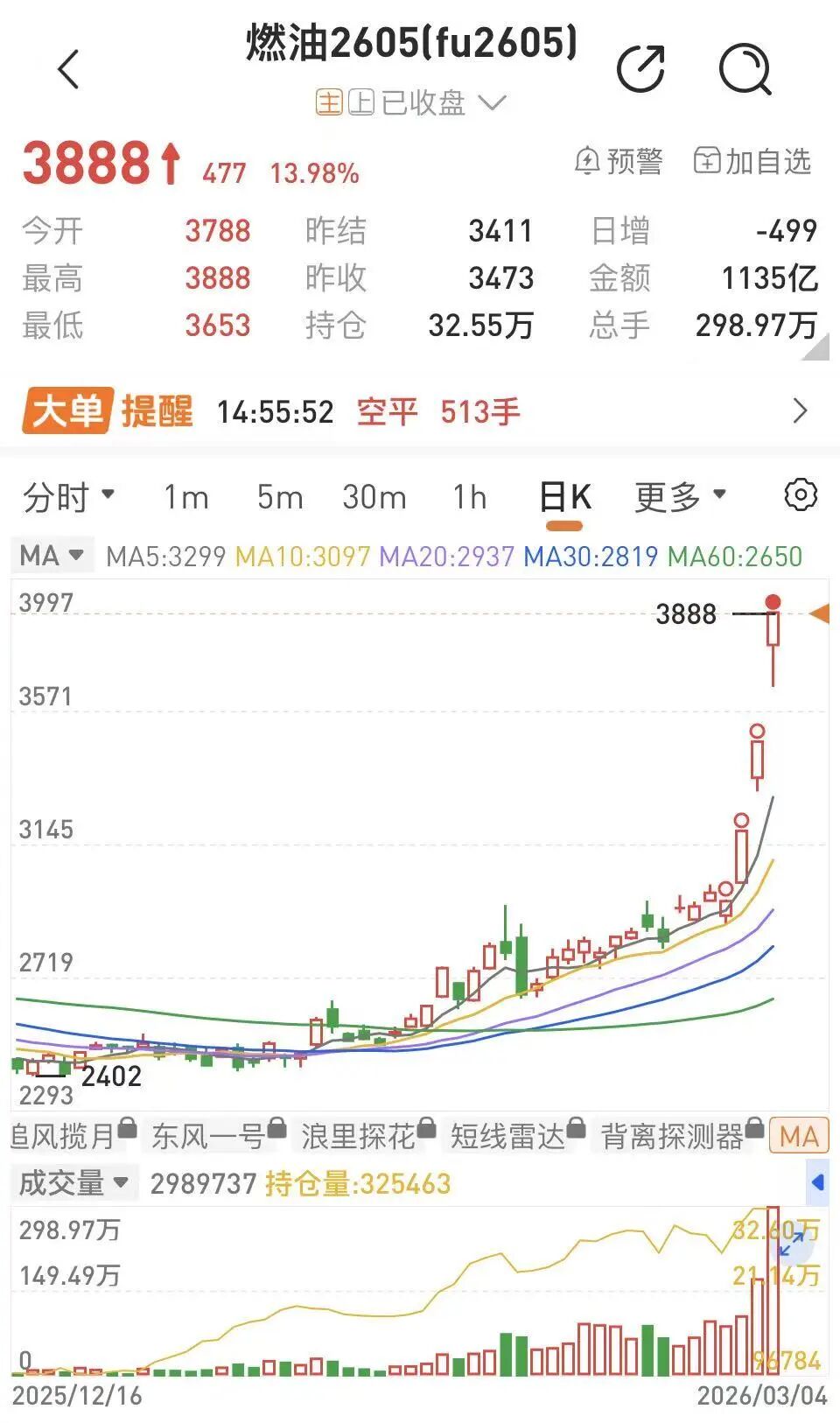受中东地缘局势紧张、原油价格波动等多重因素影响,国内燃料油期货价格近期大幅上涨,市场交易情绪升温。3月4日,燃料油期货主力合约已连续第三日涨停,本周以来累计涨幅超过30%。