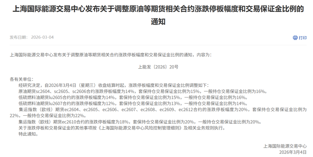 上期能源则调整了原油、低硫燃料油、集运指数(欧线)期货相关合约的风控参数。根据通知,自2026年3月4日(星期三)收盘结算时起,涨跌停板幅度和交易保证金比例调整如下: