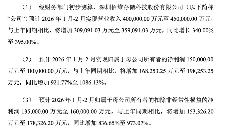佰维存储发布公告称,公司预计2026年1-2月实现营业收入40亿元至45亿元,同比增长340%至395%;归属于上市公司股东的净利润为15亿元至18亿元,同比增加921.77%至1086.13%。2026年存储行业迎来高度景气周期,AI算力与国产替代驱动DRAM/NAND价格持续上涨,行业供不应求,公司受益显著。同时,为提高公司产品在AI时代的市场竞争力,公司持续加大芯片设计、解决方案、先进封测及测试设备等领域的投入力度。