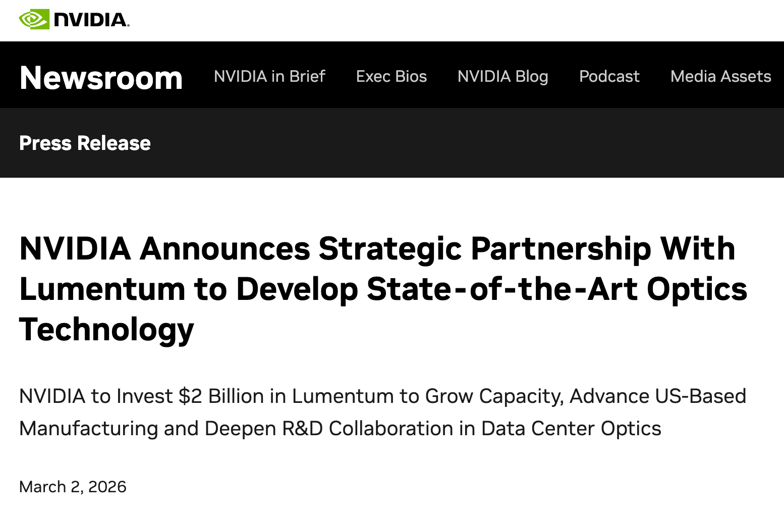 3月2日,英伟达官宣两大涉CPO(共封装光学)合作:该公司与光通信巨头Lumentum、Coherent达成战略协议,明确向两家公司各投资20亿美元,并签下巨额采购承诺与未来产能使用权。