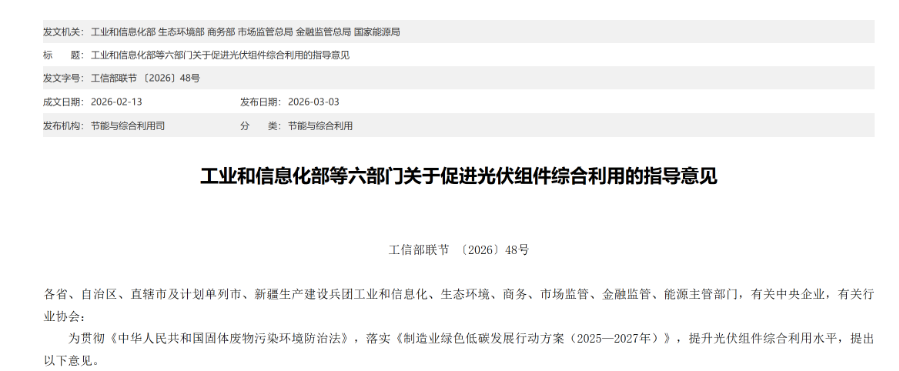 3月3日,工业和信息化部等六部委联合发布《关于促进光伏组件综合利用的指导意见》(下称《意见》)。《意见》明确了未来五年我国推动光伏组件综合利用产业健康有序发展的总要求。提出到2027年,光伏组件绿色生产水平进一步提高,再生材料使用比例有效提升,组件报废评价标准和检验检测方法得到完善;到2030年,光伏组件综合利用技术装备水平进一步提升,产业创新发展能力明显增强,综合利用产品应用场景和应用方式不断拓展,形成产业链上下游协同紧密、产能布局合理、能够应对大规模退役潮的废旧光伏组件综合利用能力。
