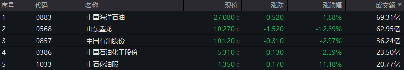 油气、航运板块跌幅居前,中石化油服跌超11%,中远海能跌超10%,中海油田服务跌超7%。