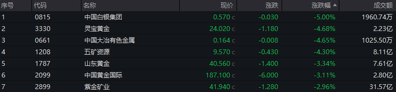 有色金属板块走低,黄金股下跌,灵宝黄金跌超4%,赤峰黄金跌超3%,老铺黄金跌超2%。