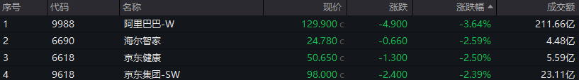 科网股普跌,阿里巴巴跌超3%,京东集团跌超2%。