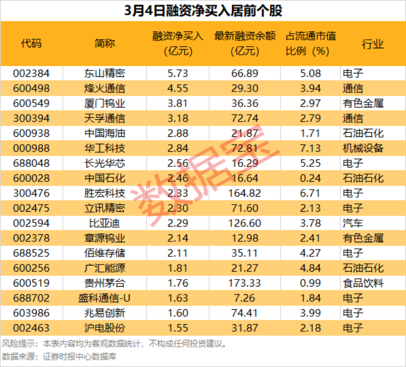 具体到个股,3月4日共有1591只股获融资净买入,净买入金额在千万元以上的有379股,其中35股融资净买入额超1亿元。东山精密融资净买入额居首,当日净买入5.73亿元;其次是烽火通信、厦门钨业,融资净买入金额分别为4.55亿元、3.81亿元;融资净买入金额居前的还有天孚通信、中国海油、华工科技等。