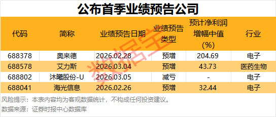 统计显示,截至目前已有4家公司预告首季业绩,奥来德、艾力斯、海光信息等一季度业绩均为预增。