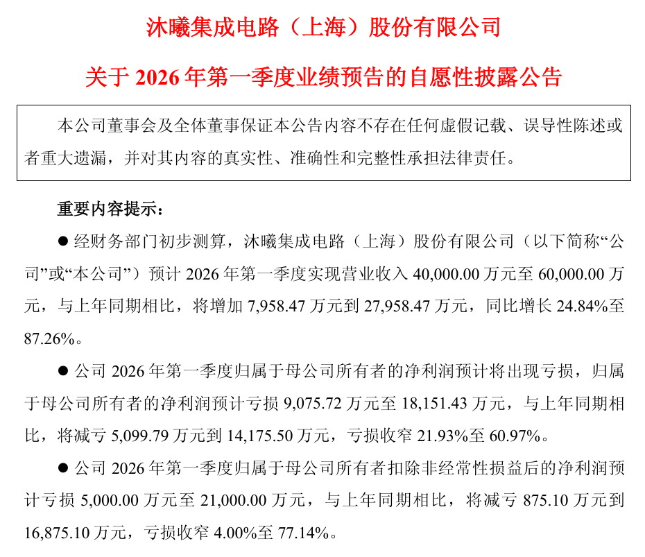3月4日晚间,沐曦股份(688802)发布一季度业绩预告。公司预计2026年第一季度实现营业收入4亿元至6亿元,与上年同期相比,将增加7958.47万元到27958.47万元,同比增长24.84%至87.26%。