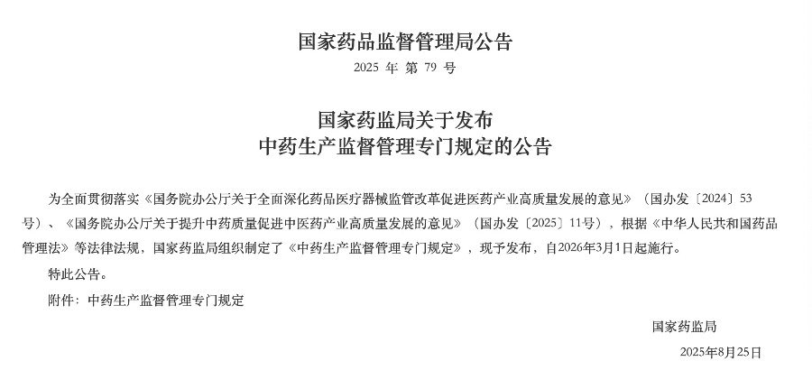 《规定》正式发布于2025年9月,聚焦中药饮片、中药配方颗粒、中药注射剂等重点领域的行业顽疾,从法律层面明确生产环节的禁止性规范,填补了此前监管规则细化不足的短板。