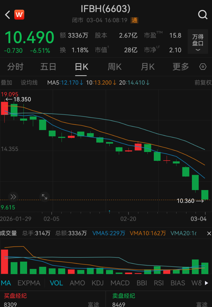 目前IFBH每股报10.49港元,总市值28亿港元。而IFBH上市首日的收盘市值为105.3亿港元,意味着其自上市以来市值已蒸发77.3亿港元。