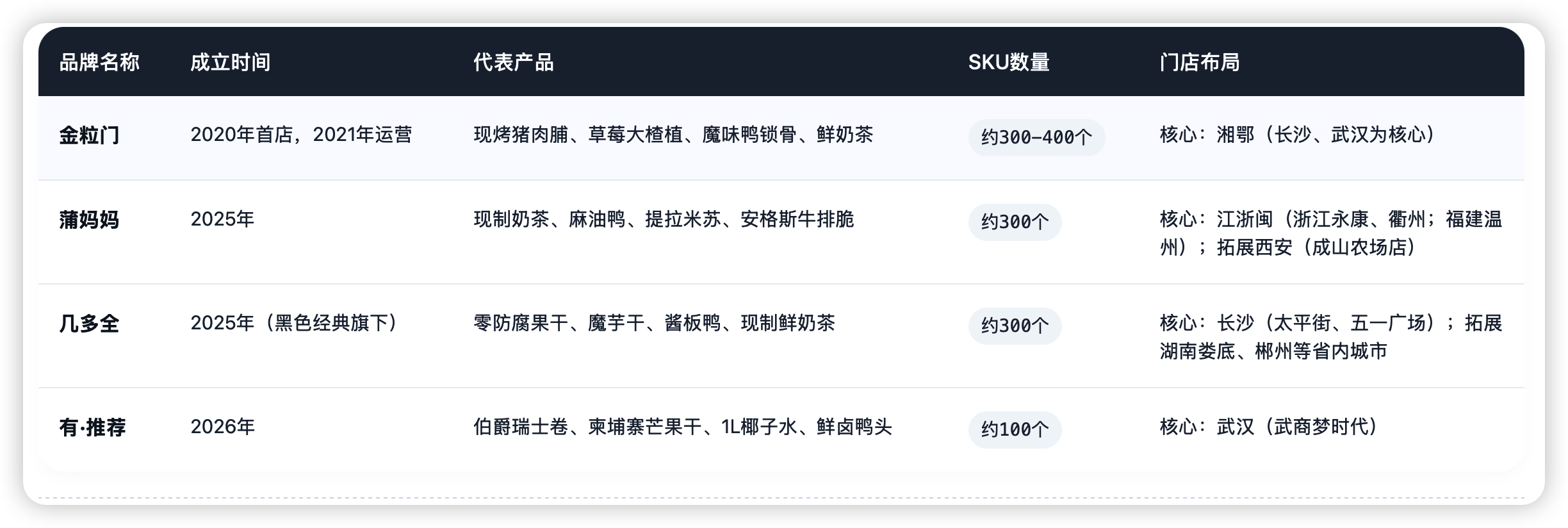 几多全则是赛道内的“后起之秀”,作为黑色经典(长沙小吃头部品牌)旗下的新鲜零食品牌,企业自2025年开出首店以来,依托母公司成熟的供应链快速扩张。2025年底,几多全签约及开业门店覆盖湖南、重庆、江西、四川等多个省份,2026年初又迅速进驻广州、成都等市场,截至2月已开出69家自营门店。