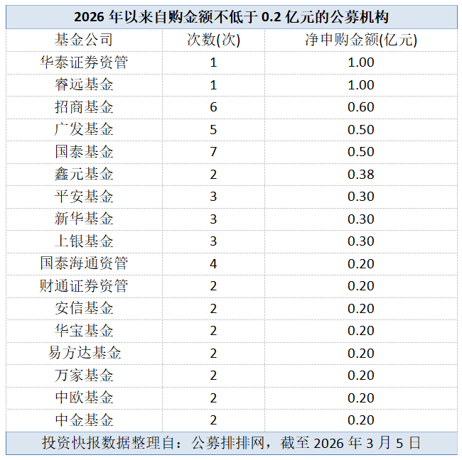 2026年初,公募机构掀起自购热潮。投资快报记者从公募排排网数据梳理出,截至2026年3月5日,今年以来共有41家公募机构自购旗下基金75次,合计自购金额达8.90亿元。
