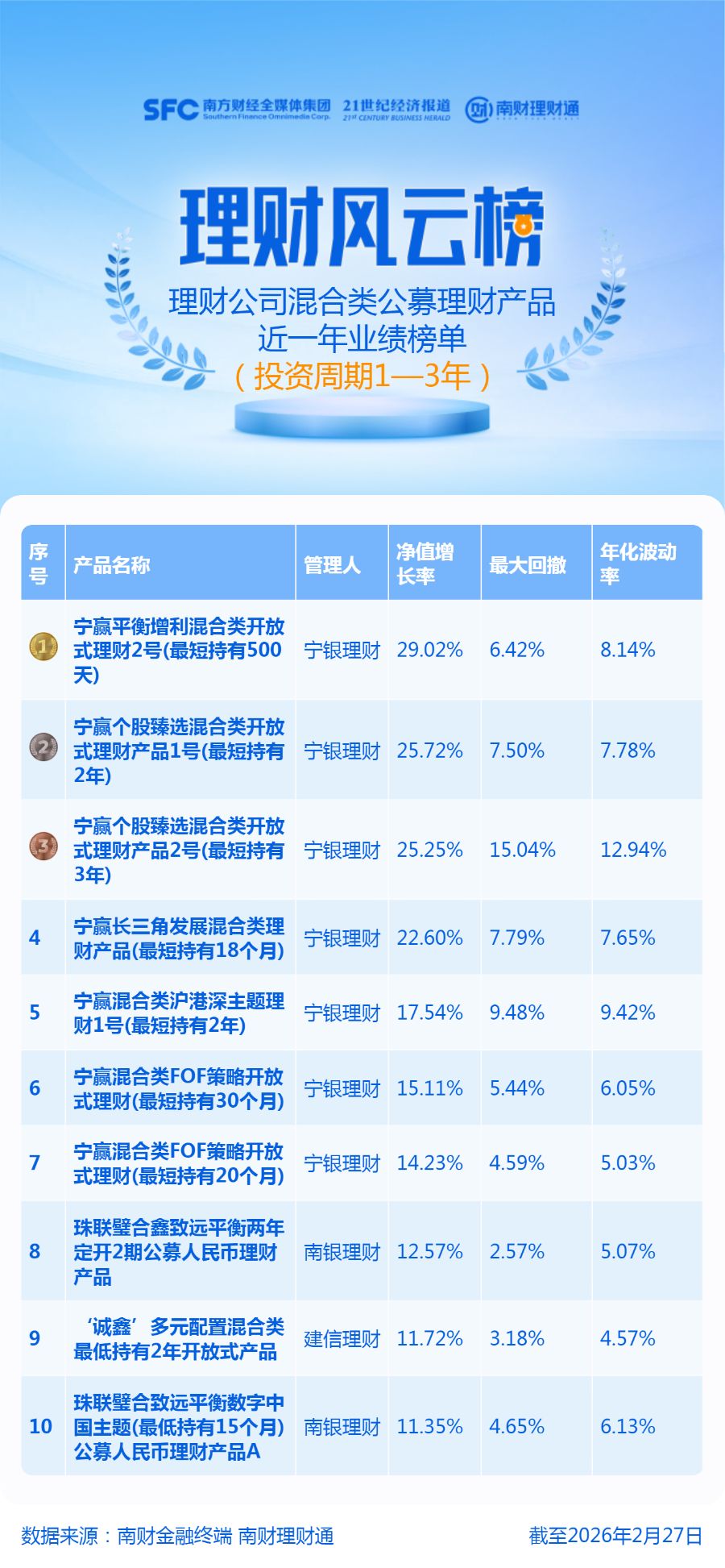 产品统计范围为理财公司1—3年(含)期限的混合类公募理财,产品统计截止日期为2026年2月27日,统计区间为近一年。