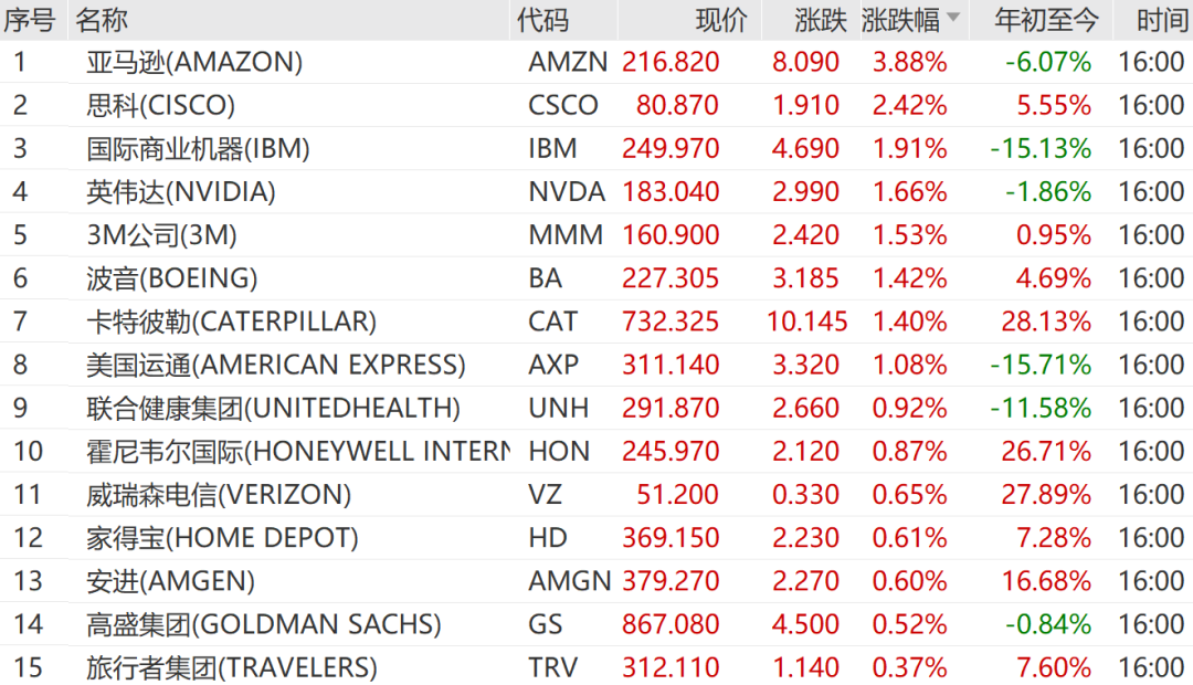 亚马逊涨3.88%,思科涨2.42%,IBM涨1.91%,领涨道指。