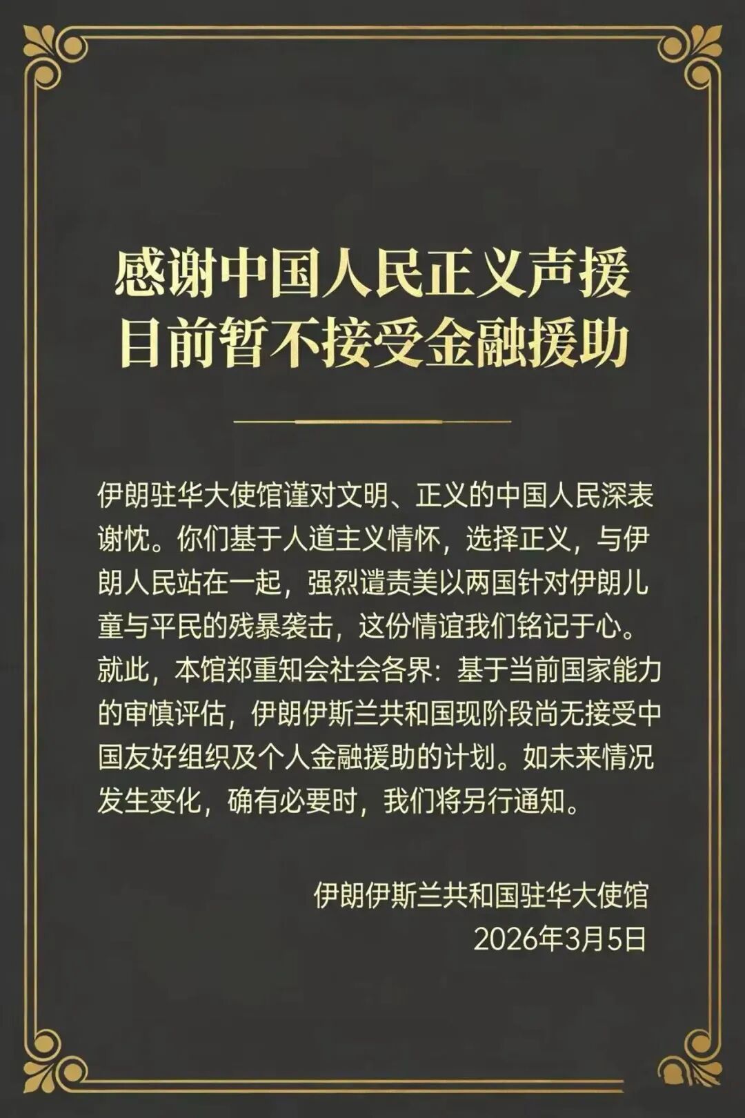 3月5日,伊朗驻华大使馆发文表示:谨对文明、正义的中国人民深表谢忱。你们基于人道主义情怀,选择正义,与伊朗人民站在一起,强烈谴责美以两国针对伊朗儿童与平民的残暴袭击,这份情谊我们铭记于心。就此,本馆郑重知会社会各界:基于当前国家能力的审慎评估,伊朗伊斯兰共和国现阶段尚无接受中国友好组织及个人金融援助的计划。如未来情况发生变化,确有必要时,我们将另行通知。