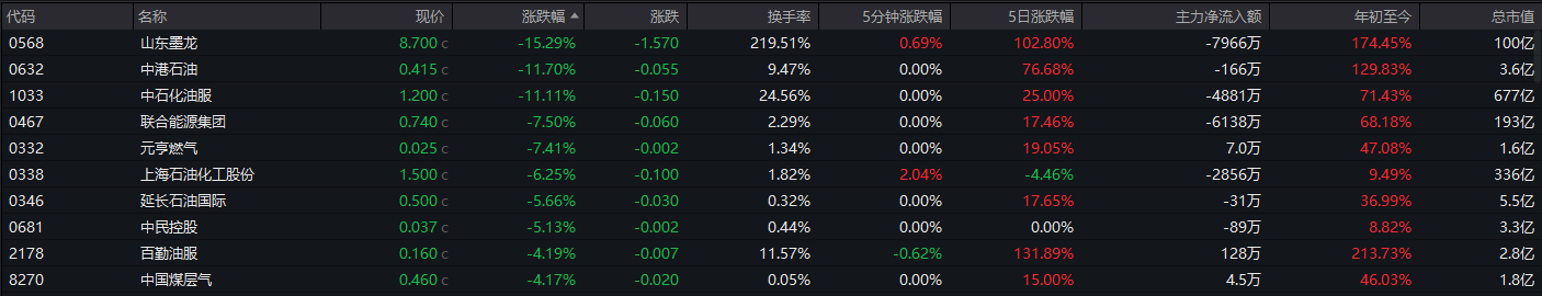 油气设备板块领跌,山东墨龙跌超15%,中石化油服跌超11%;