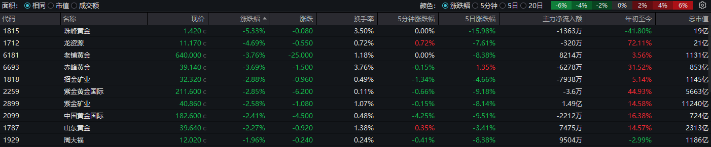 黄金板块下挫,珠峰黄金跌超5%,赤峰黄金、老铺黄金跌超3%;
