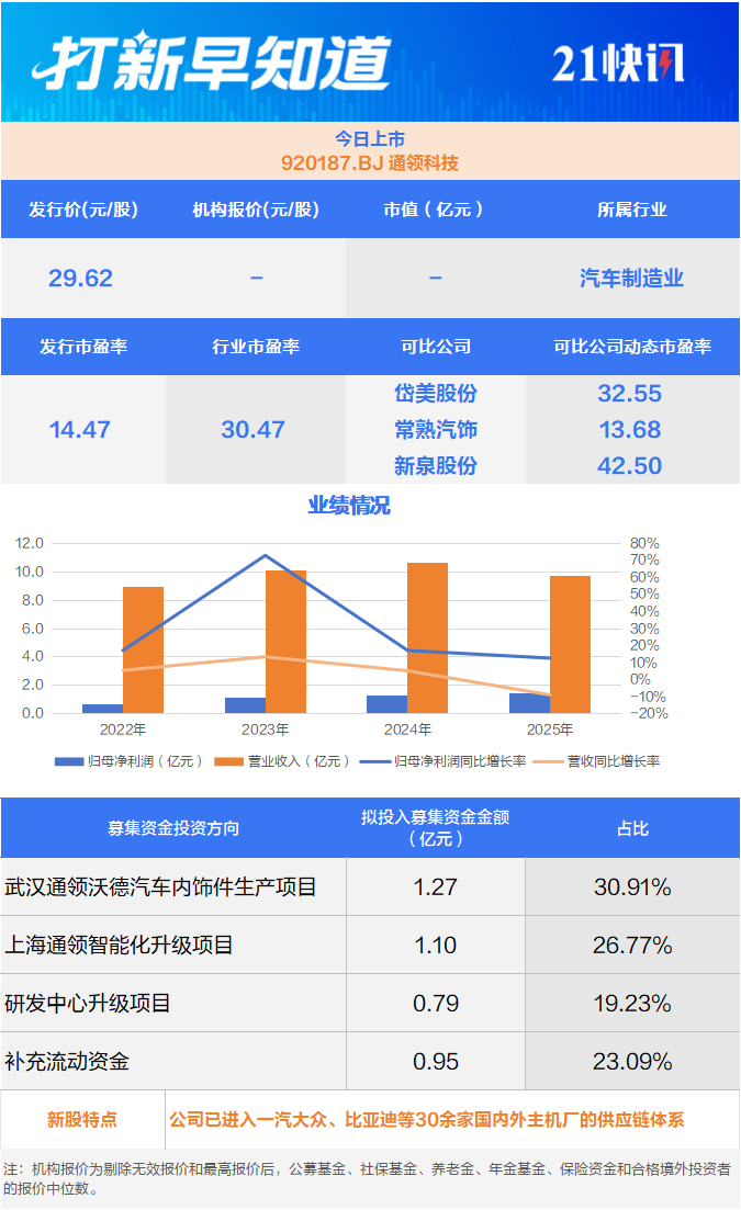 3月5日,有一只新股上市,为北交所的通领科技(920187.BJ)。该公司致力于汽车内饰件的研发、生产及销售,是一家集产品研发设计、模具自主开发、产品生产及销售为一体的高新技术企业,是国家级专精特新“小巨人”企业。主要产品包括门板饰条、主仪表饰板、中控饰板等,主要应用于乘用车领域。