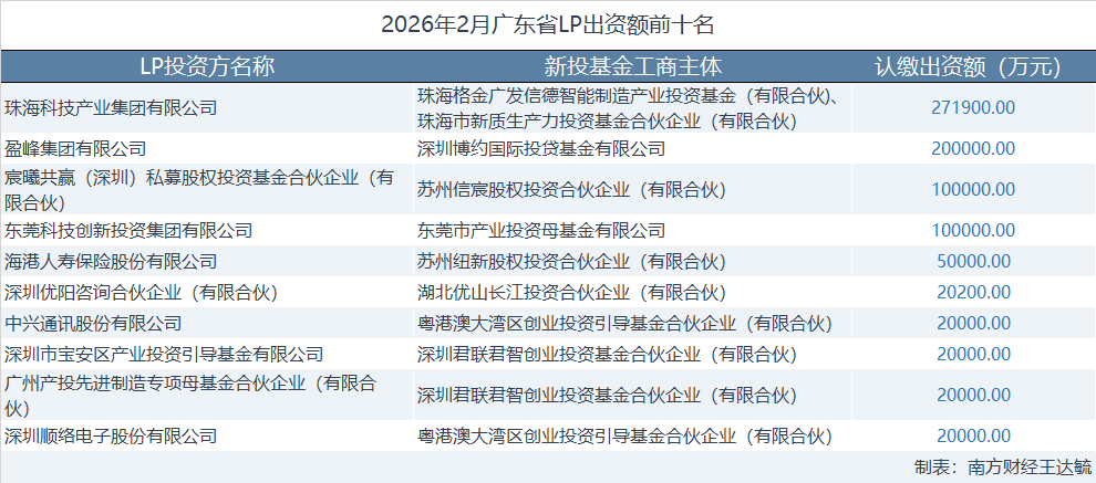 2月有出资记录的广东LP数量共有59家,本月认缴出资额最高的LP为珠海科技产业集团有限公司,共认缴出资27.19亿元。