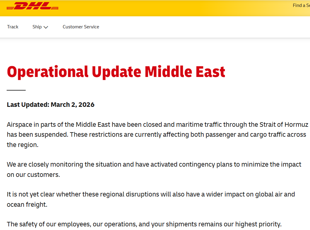 DHL表示,中东部分地区的领空关闭,通过霍尔木兹海峡的海上交通已被暂停,目前,这些限制措施正在影响该地区的客运和货运交通。公司正在密切关注事态发展,并已启动应急计划以尽量减少对客户的影响。目前尚不清楚这些区域性干扰是否还会对全球的航空和海运货运产生更广泛的影响。