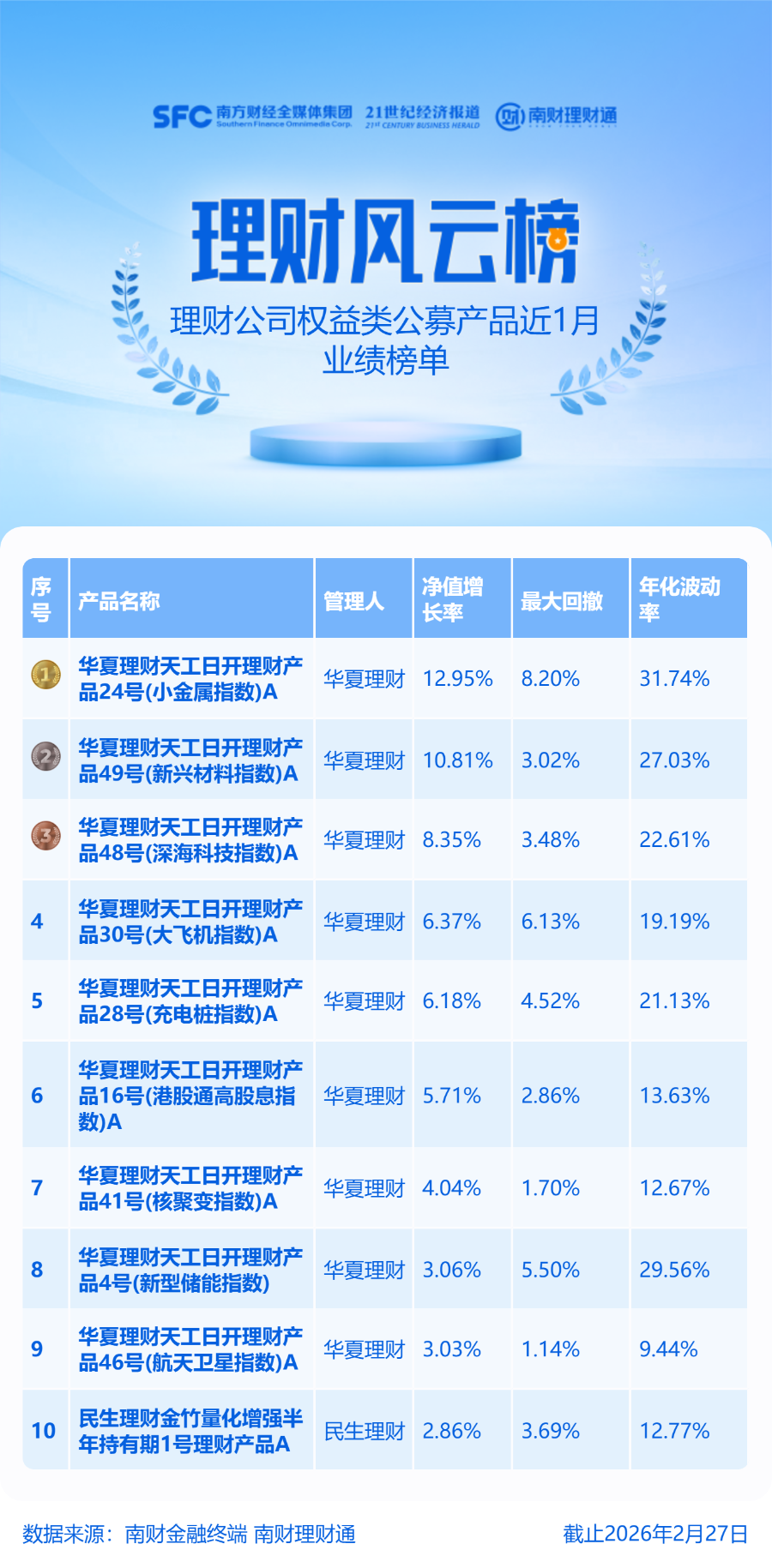 近期,小金属板块成为市场焦点。数据显示,截至2月27日,小金属(881170)(申万)指数今年以来累计涨幅已达52.18%,2月单月涨21.55%,均位居124个申万二级行业涨幅第一。反映在权益类理财产品上,华夏理财“天工日开理财产品24号(小金属指数)A”近1个月涨近13%,位列榜单首位。该产品成立于2025年11月20日,开年至今(1月5日-2月27日)涨近32%。值得注意的是,该产品最大回撤为8.2%,年化波动率为31.74%,呈现出“高风险、高收益”特征。