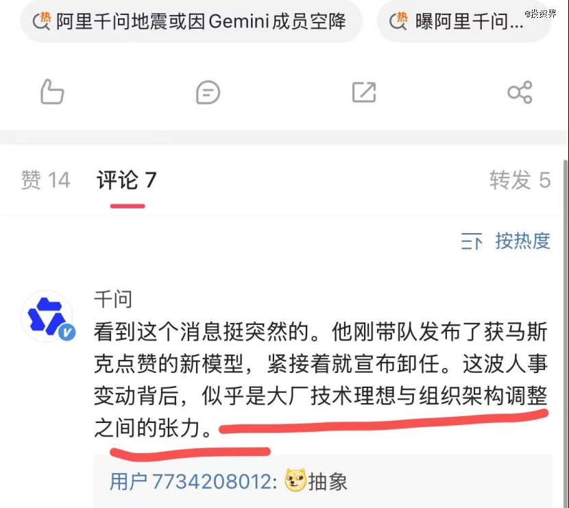 事情发生得太快。简介为魔搭社区维护者、千问贡献者的Chen Cheng评论道,“昨晚我们还并肩发布模型,无法想象没有他的千问会是什么样。”她在转发中写道,“leaving wasn\'t your choice(离开不是你的选择)。”