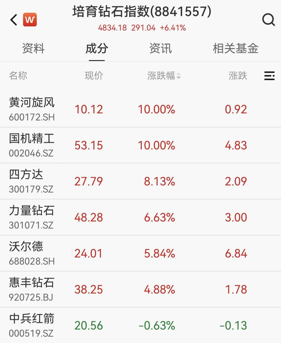 3 月 5 日,A股培育钻石板块迎来大幅异动,成为资本市场焦点。截至当日13时31分,培育钻石指数(8841557.WI)大涨 6.41%,成分股中,黄河旋风、国机精工强势涨停,四方达、力量钻石、沃尔德等核心标的同步跟涨,板块热度持续攀升。