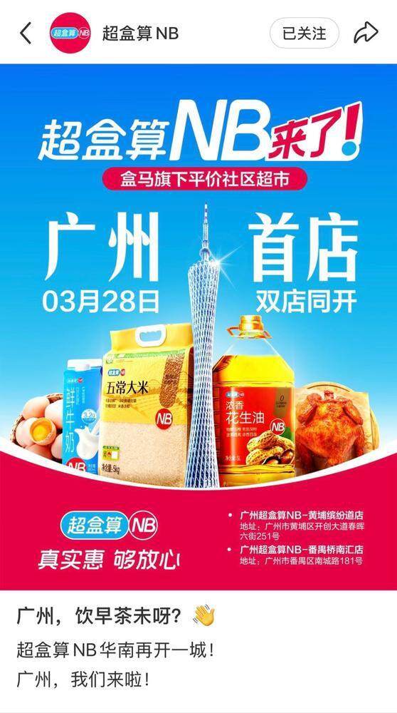 记者从盒马获悉,继今年1月进入东莞、深圳后,盒马旗下硬折扣品牌超盒算NB即将在广州亮相。近日,超盒算NB官宣两家新店将于3月28日在广州开业,首批两家门店落子黄埔区和番禺区。