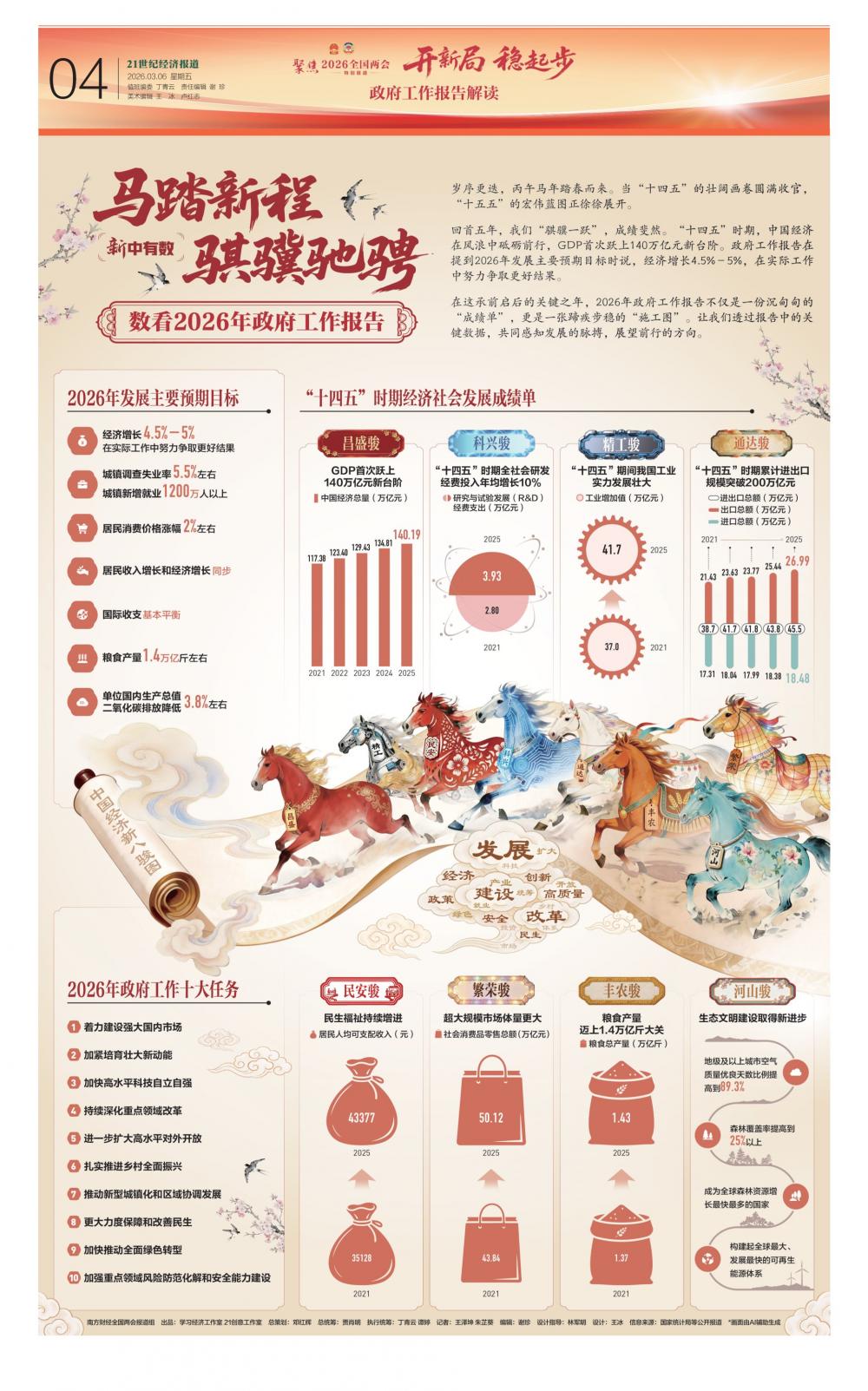在这承前启后的关键之年,2026年政府工作报告不仅是一份沉甸甸的“成绩单”,更是一张蹄疾步稳的“施工图”。让我们透过报告中的关键数据,共同感知发展的脉搏,展望前行的方向。