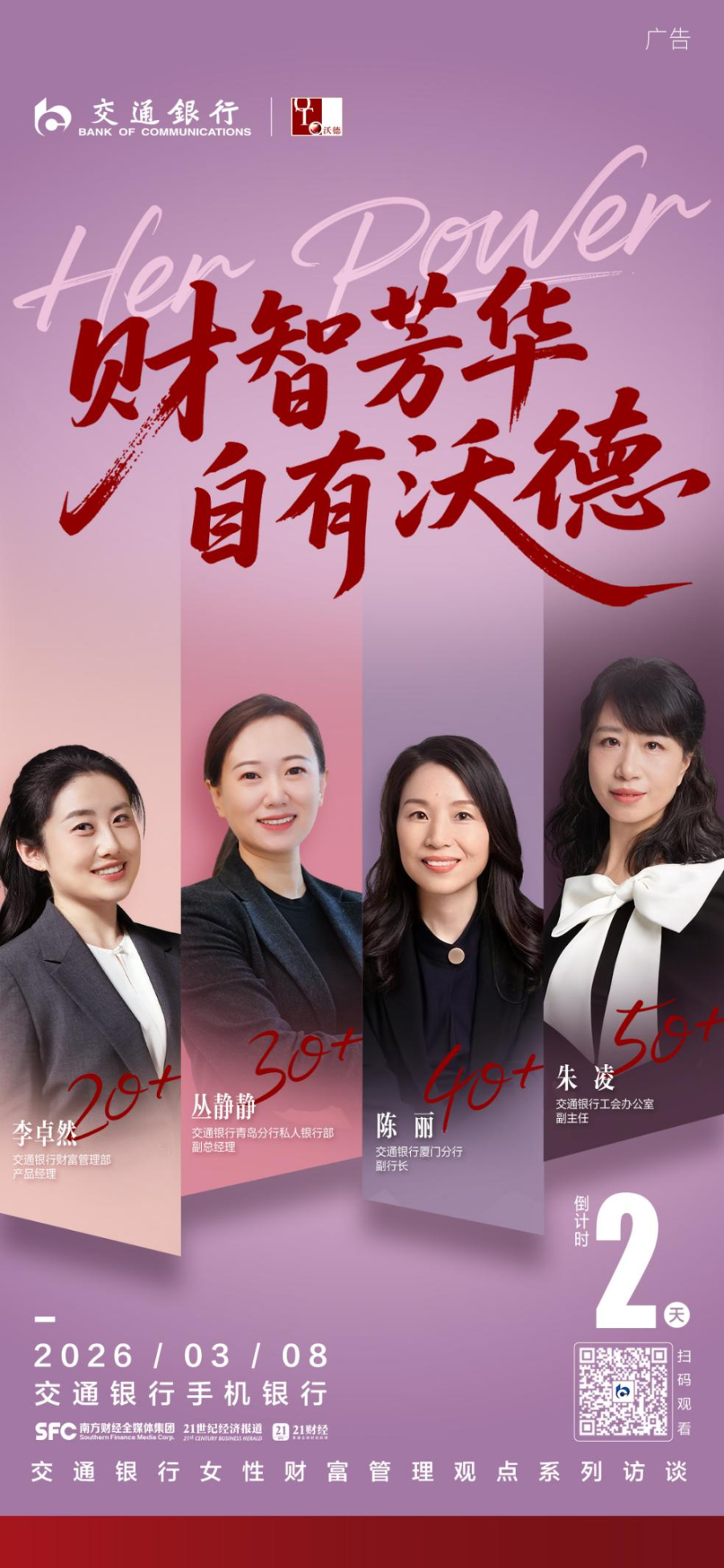 三八妇女节将至,我们将推出一组暖心视频,镜头里有她们绚丽多彩的人生姿态和专属财富智慧。敬请期待!