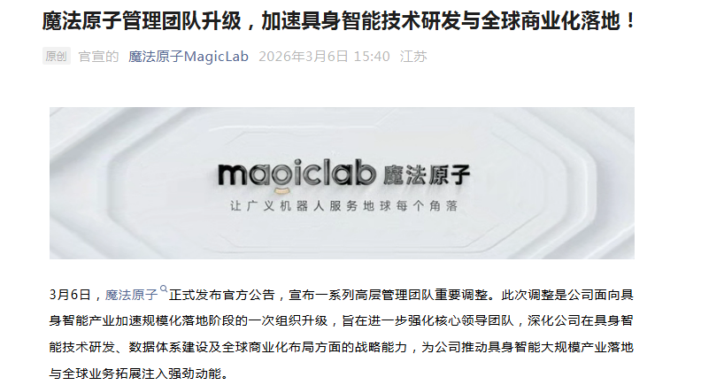 对于此次组织升级,魔法原子联合创始人顾诗韬表示,公司面向产业规模化落地的系统性调整,将强化技术、数据与商业化的协同能力。CTO陈春玉则称,行业专家的加入将加速新产品研发与量产交付。