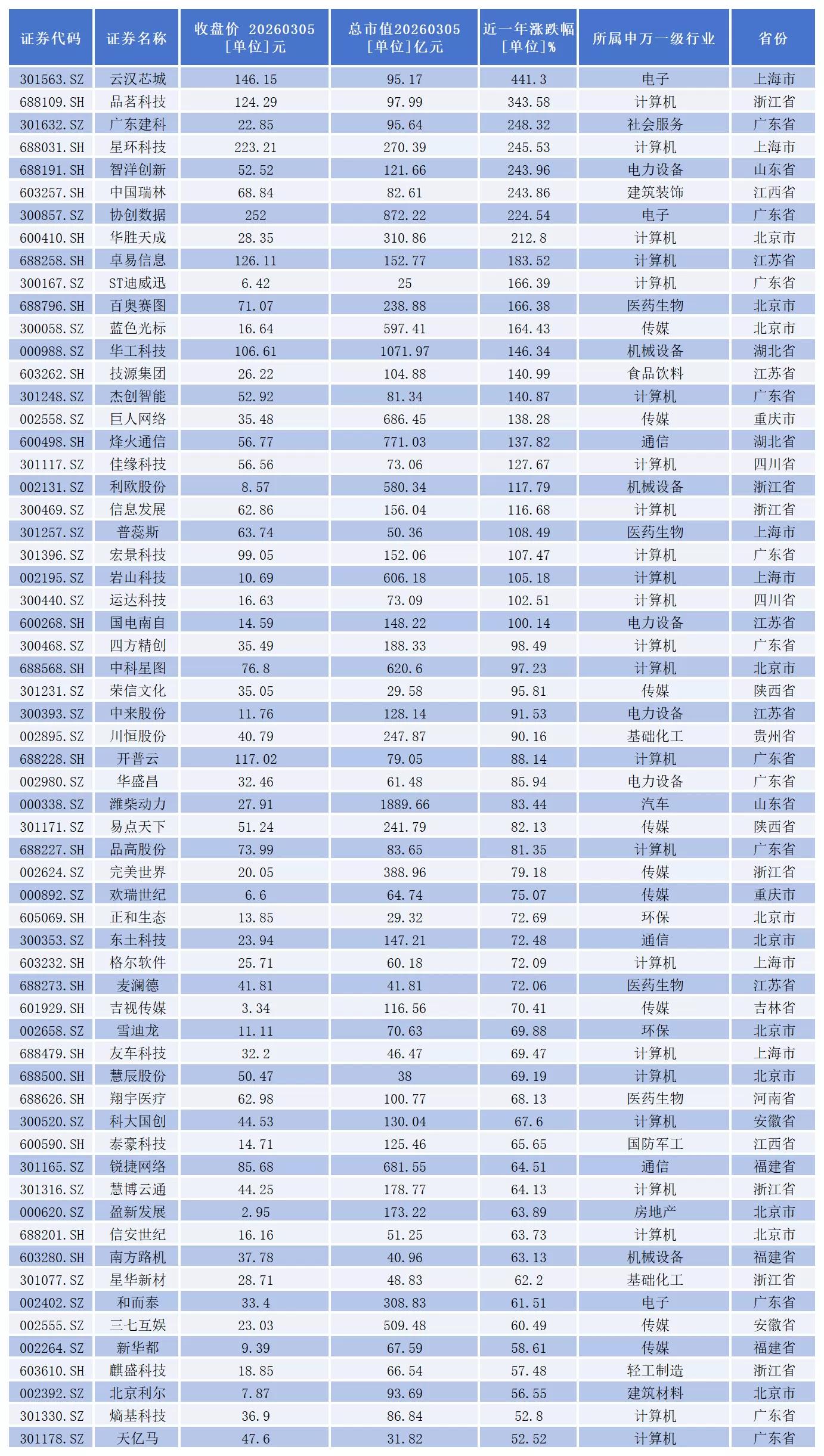 云汉芯城(301563.SZ)、品茗科技(688109.SH)、广东建科(301632.SZ)、星环科技(688031.SH)、智洋创新(688191.SH)、中国瑞林(603257.SH)、协创数据(300857.SZ)、华胜天成(600410.SH)、卓易信息(688258.SH)、ST迪威迅(300167.SZ)、百奥赛图(688796.SH)等25家公司近一年股价累计涨幅已经成功实现翻倍。