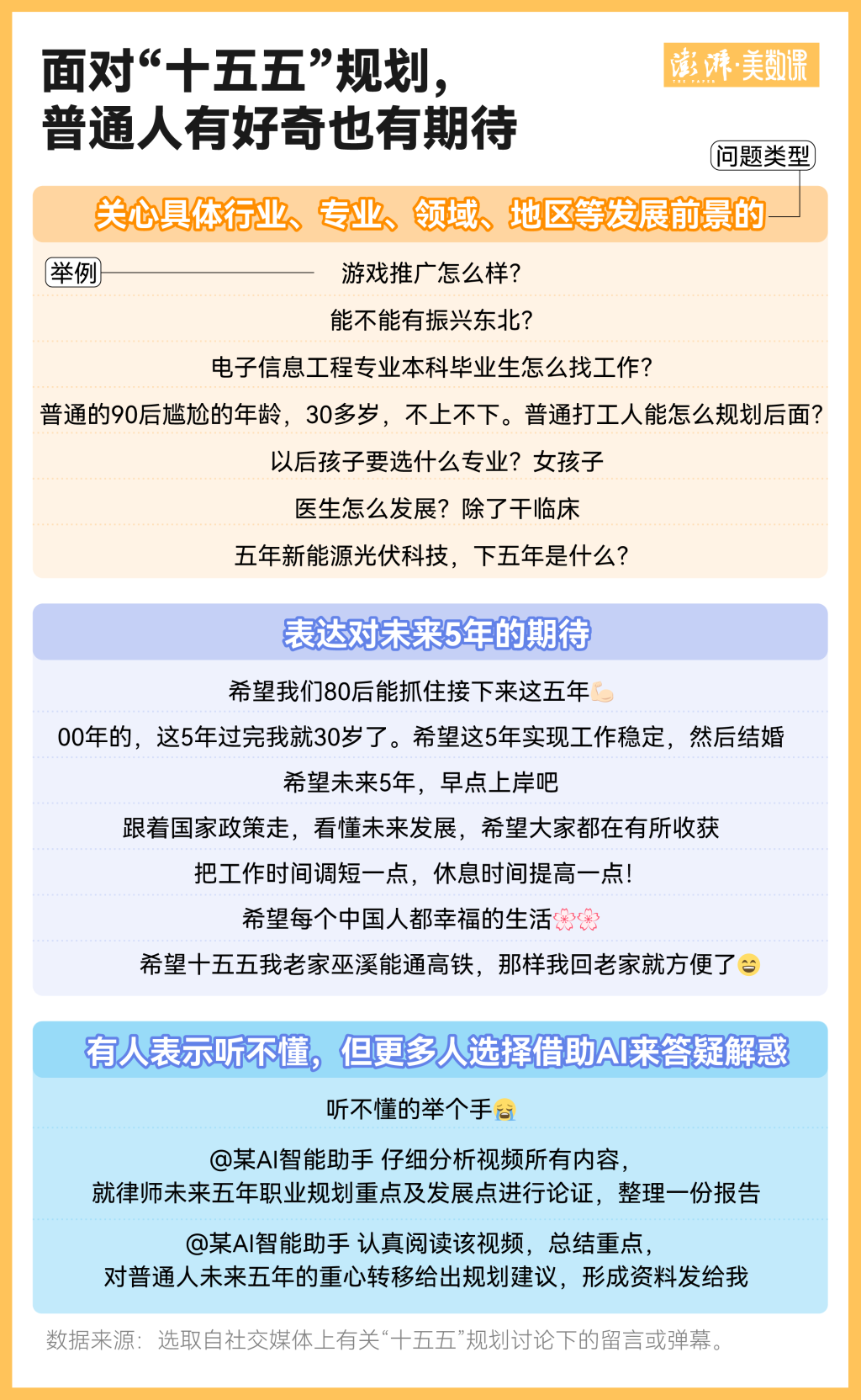 虽然有人说“国家规划的蓝图离自己太远”“国家大政方针听不懂”,但澎湃美数课工作室在梳理相关网友互动时发现,这份规划所蕴含的未来感,让很多普通人写下了自己的愿景:有人在憧憬5年后的自己能有一个更美好的人生,有人想通过这份规划来为自己在未来5年做出更好的人生选择,还有相当多的人在借助AI来帮自己答疑解惑。